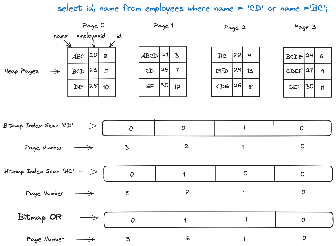 Subsequently, PostgreSQL executed a BitmapOr operation to combine the results of the scans on columns a and b.