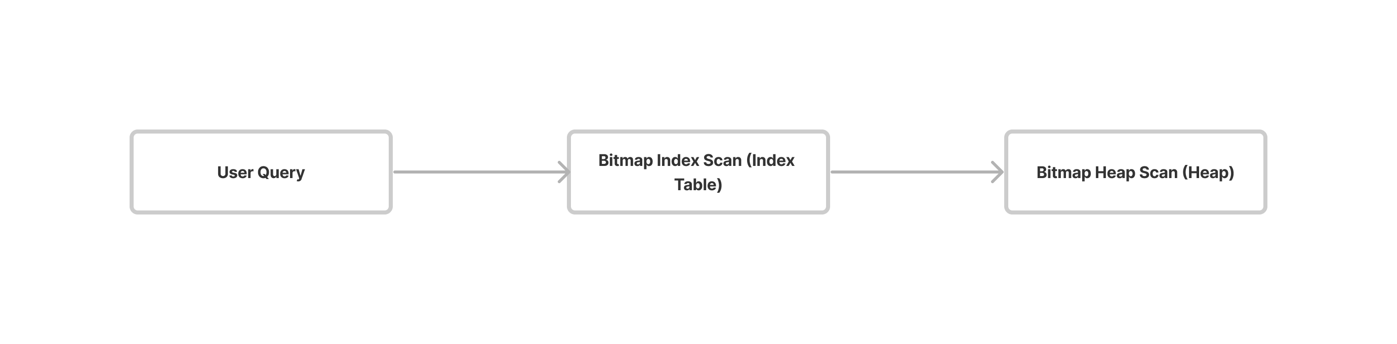 After obtaining the references for the rows to be retrieved, PostgreSQL proceeds to perform a bitmap heap scan.