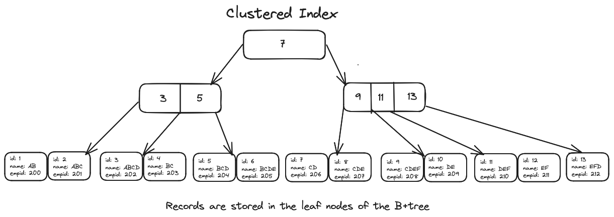 Index and data reside together and are ordered by the key. A Clustered Index is basically a tree-organized table. Instead of storing the records in an unsorted Heap table space, the clustered index is actually B+Tree index having the Leaf Nodes, which are ordered by the clusters key column value, store the actual table records, as illustrated by the following diagram.