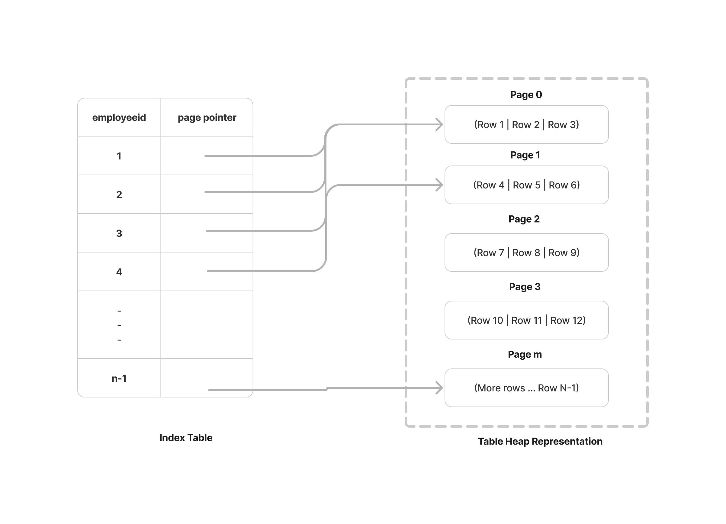 In this instance, there is no need to access the heap to retrieve the complete record. Since the required value for employeeid is already present in the index table, the operation is streamlined, and it directly performs an Index Only Scan. This approach allows the system to retrieve the specific employeeid directly from the index table without the additional step of fetching the complete row from the heap. This can lead to improved performance, particularly when the index includes all the columns needed for the query, minimizing the amount of data that needs to be processed.