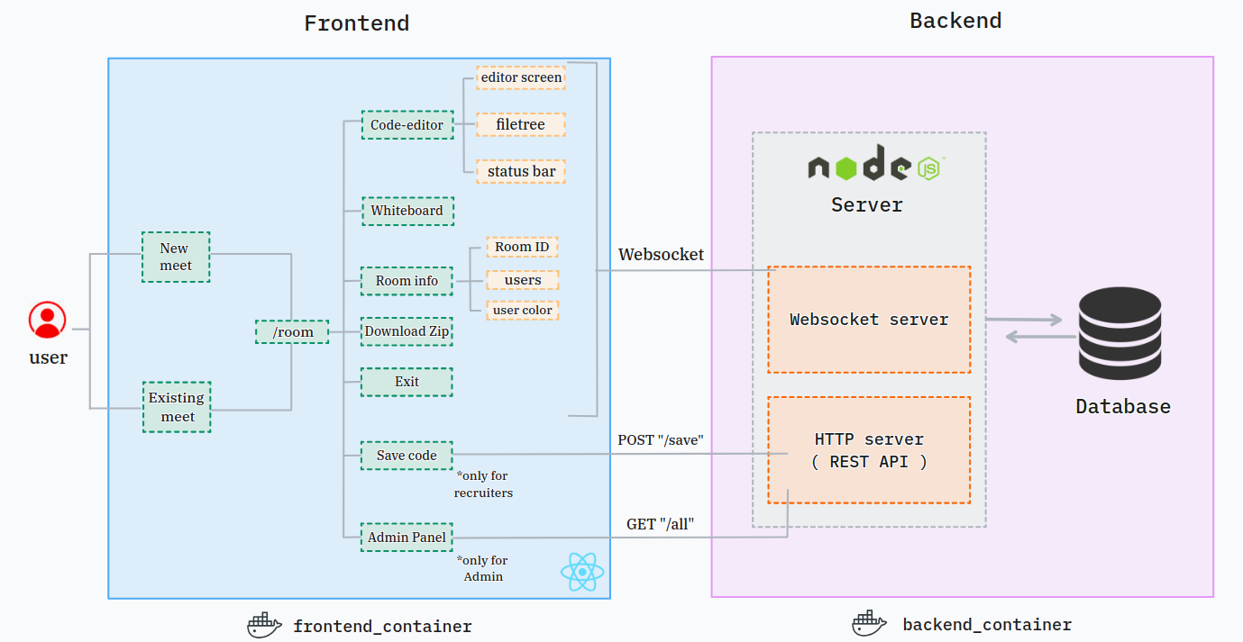 Utilising a Node.js server with the Express framework, the application listens for incoming HTTP requests through RESTful API routes. The server efficiently handles data persistence by saving user input code to the database. Additionally, it provides administrative functionality to retrieve all saved data sets from the database.